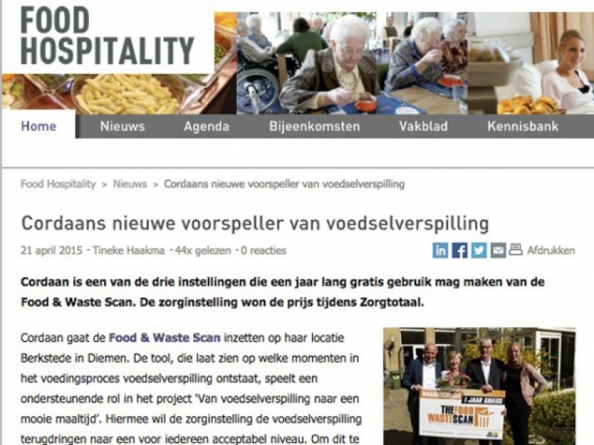 Cordaan gaat de Food & Waste Scan inzetten op haar locatie Berkstede in Diemen. De tool, die laat zien op welke momenten in het voedingsproces voedselverspilling ontstaat, speelt een ondersteunende rol in het project ‘Van voedselverspilling naar een mooie maaltijd’. Hiermee wil de zorginstelling de voedselverspilling terugdringen naar een voor iedereen acceptabel niveau. Om dit te bereiken wordt er binnen een jaar een nieuw, duurzaam voedingsconcept geïntroduceerd.